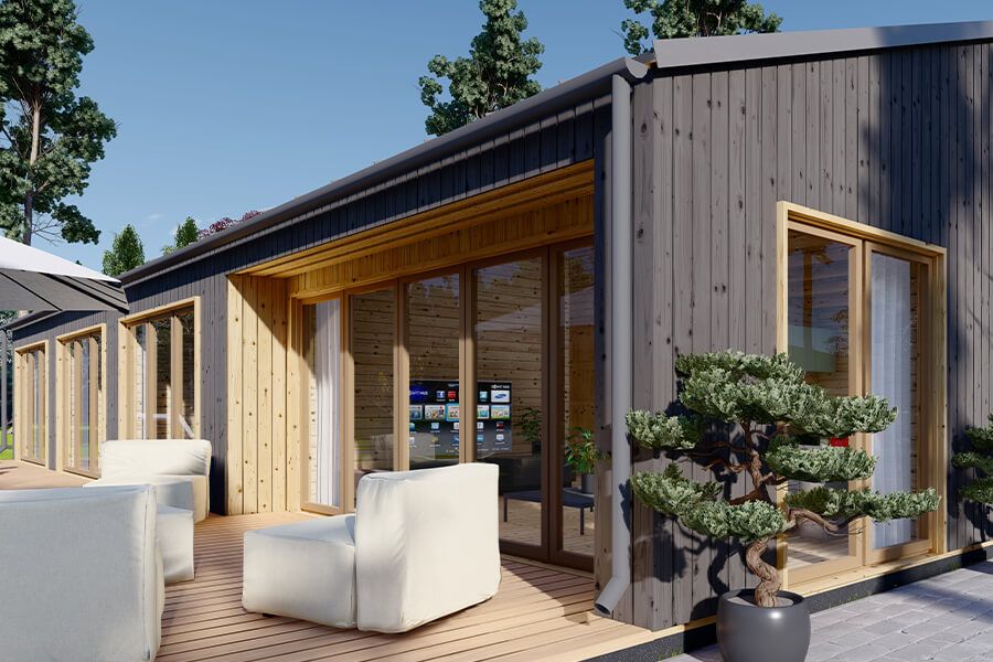 Where modern design meets the utmost practicality, the beauty of our exceptional wooden house TESSA arises. Featuring a convenient and aesthetically pleasing L-shape layout, numerous multifunctional rooms, a spacious covered terrace, and two bathrooms, this house is a real gem for anyone searching for a stylish home or family vacation space. We are thrilled to introduce you with this model – it could transform your residential or lounging experience to completely new heights!
