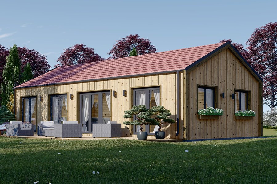 This granny annexe model was developed having big families, who value spaciousness of their living area, in mind. It is designed to comfortably accommodate up to six people in three separate bedrooms. The cabin also features a big living room area with direct access to the garden.