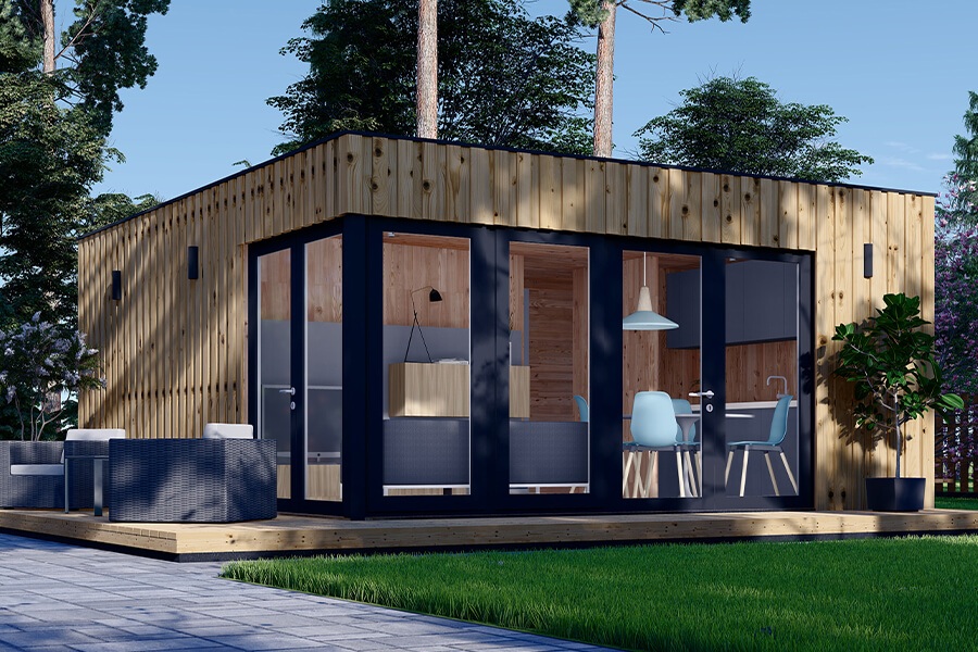 A cosy and stylish insulated PREMIUM garden room works as a great base for creating a lovely bureau, workshop, home gym or art studio. Due to large PVC windows and doors paired with the insulation of the SIPs panels, this garden room is not only exceptionally bright and modern but also provides extremely high thermal insulation properties.