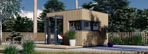 If you're looking to set up a private office space in your garden, this compact model should be one of the best options to consider. It features stylish vertical cladding, takes up only 9 m² of space, and has a smooth finish accentuated by the modern flat roof. In addition, more than half the model's perimeter features some kind of glass window – either nearly floor-to-ceiling or a smaller one. So, if you'd like to appreciate the joy of sunny days in your garden office pod, the light will definitely hit your bookshelves here.