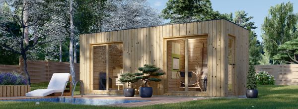 • This practical structure with over 12 m² of internal space is divided into a sauna room, a changing room with space for a shower, and a lounging area.• The modern vertical cladding adds another layer of insulation and makes the compact building look taller.